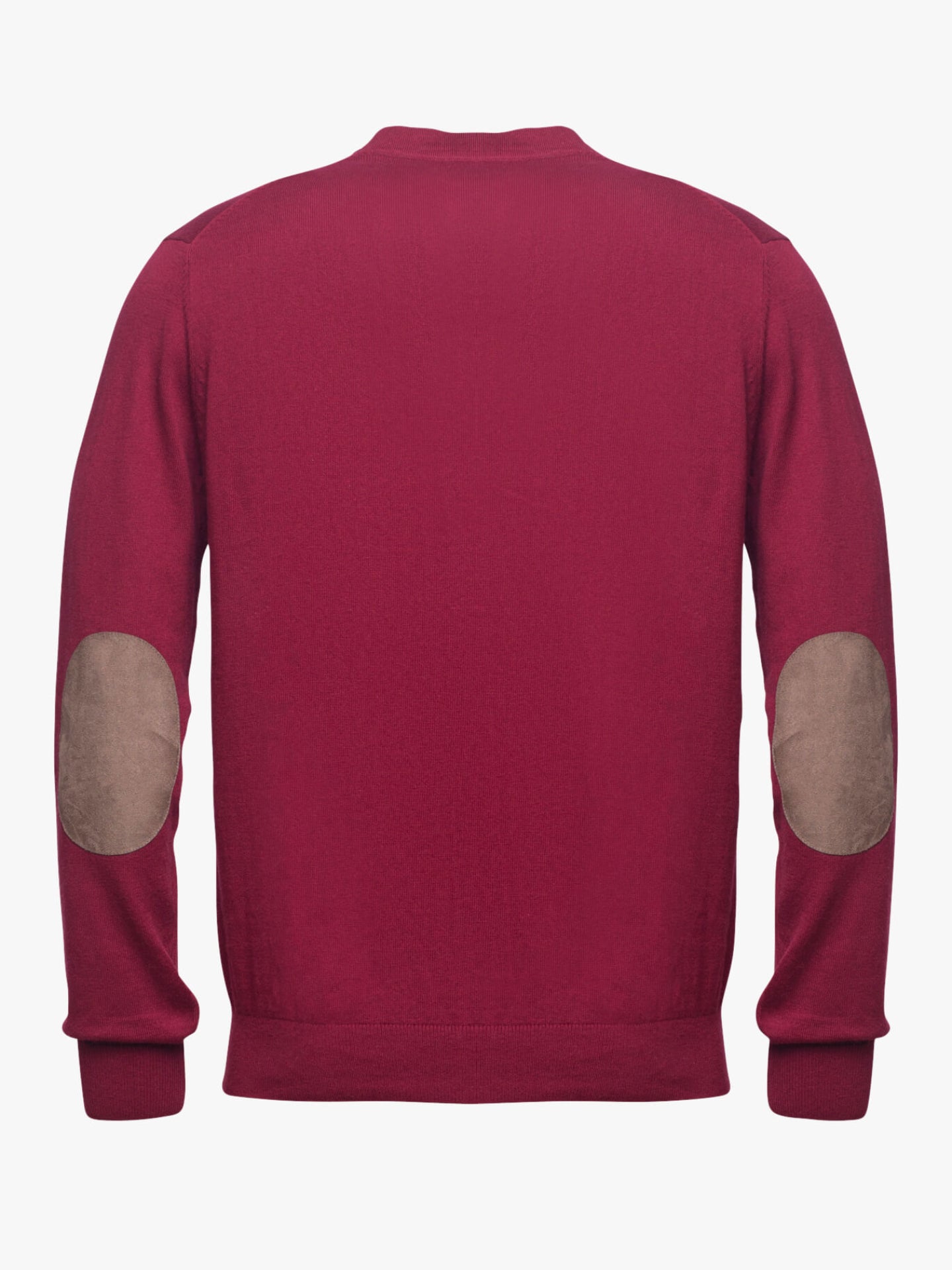 Cardigan para homem liso bordeaux com fecho botões e pormenor placket e cotoveleiras em beige escuro. Confecionado em tecido de algodão e caxemira. Corte casual, gola em bico, manga comprida e acabamentos canelados.