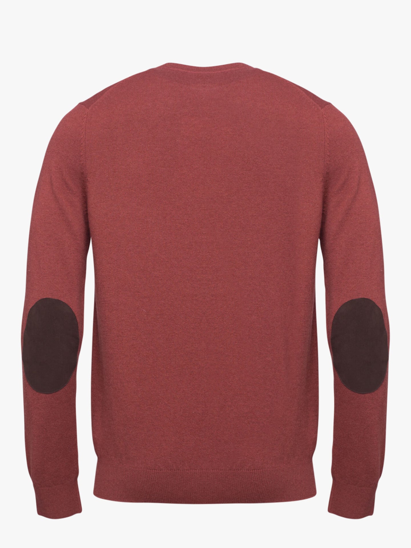 Camisola para homem laranja tijolo com cotoveleiras em castanho escuro. Confecionada em lã. Corte reto, gola em bico, manga comprida e acabamentos canelados