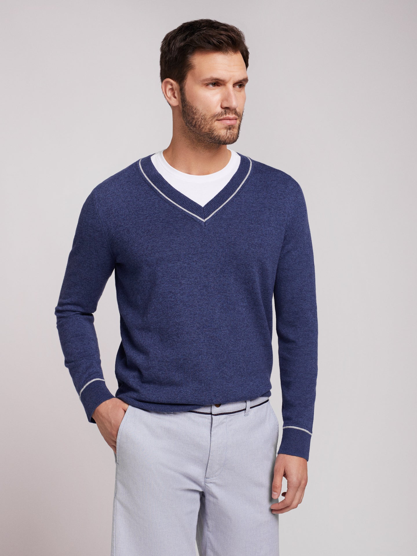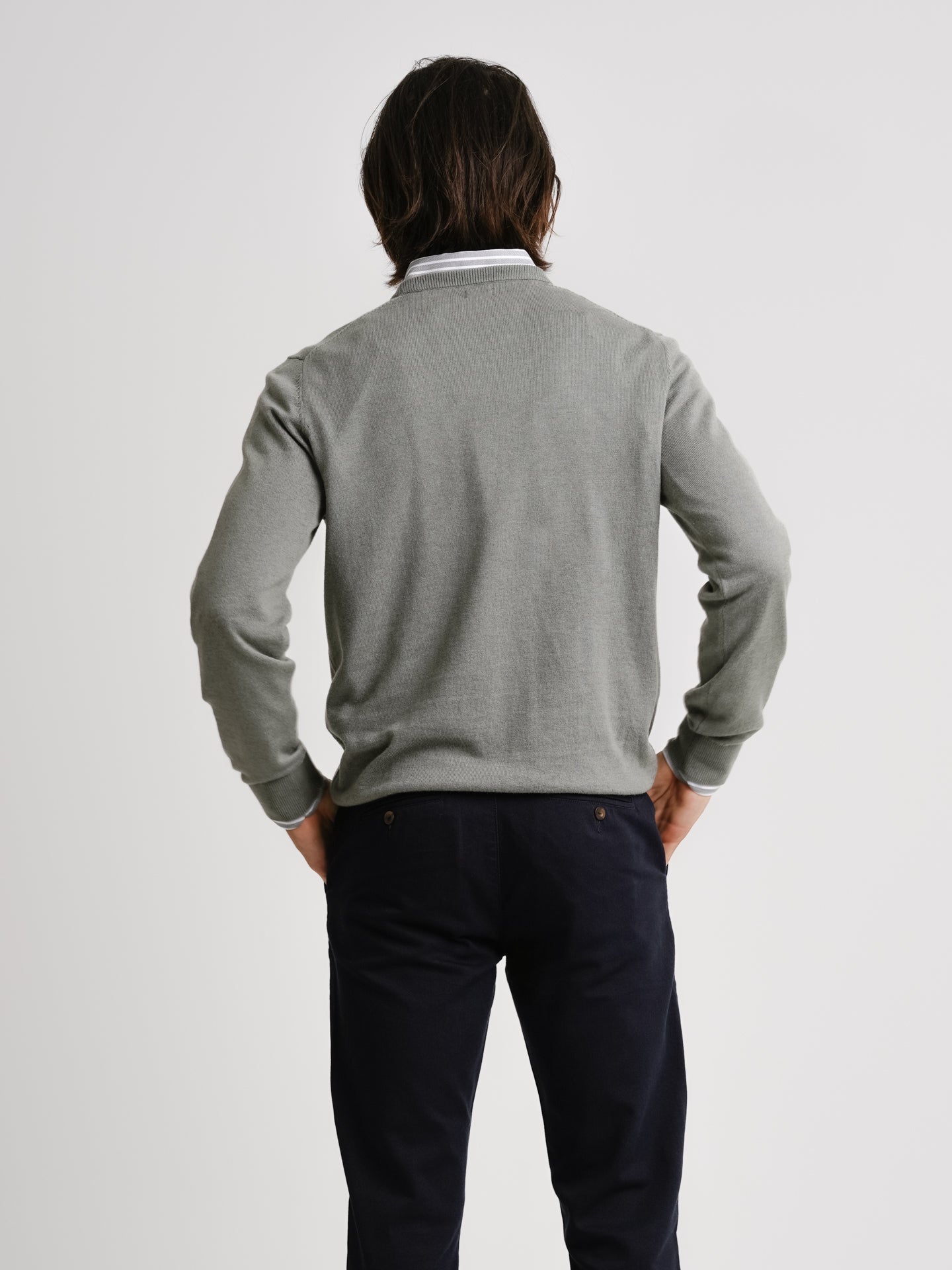 Pullover algodão decote em V com detalhe colarinho