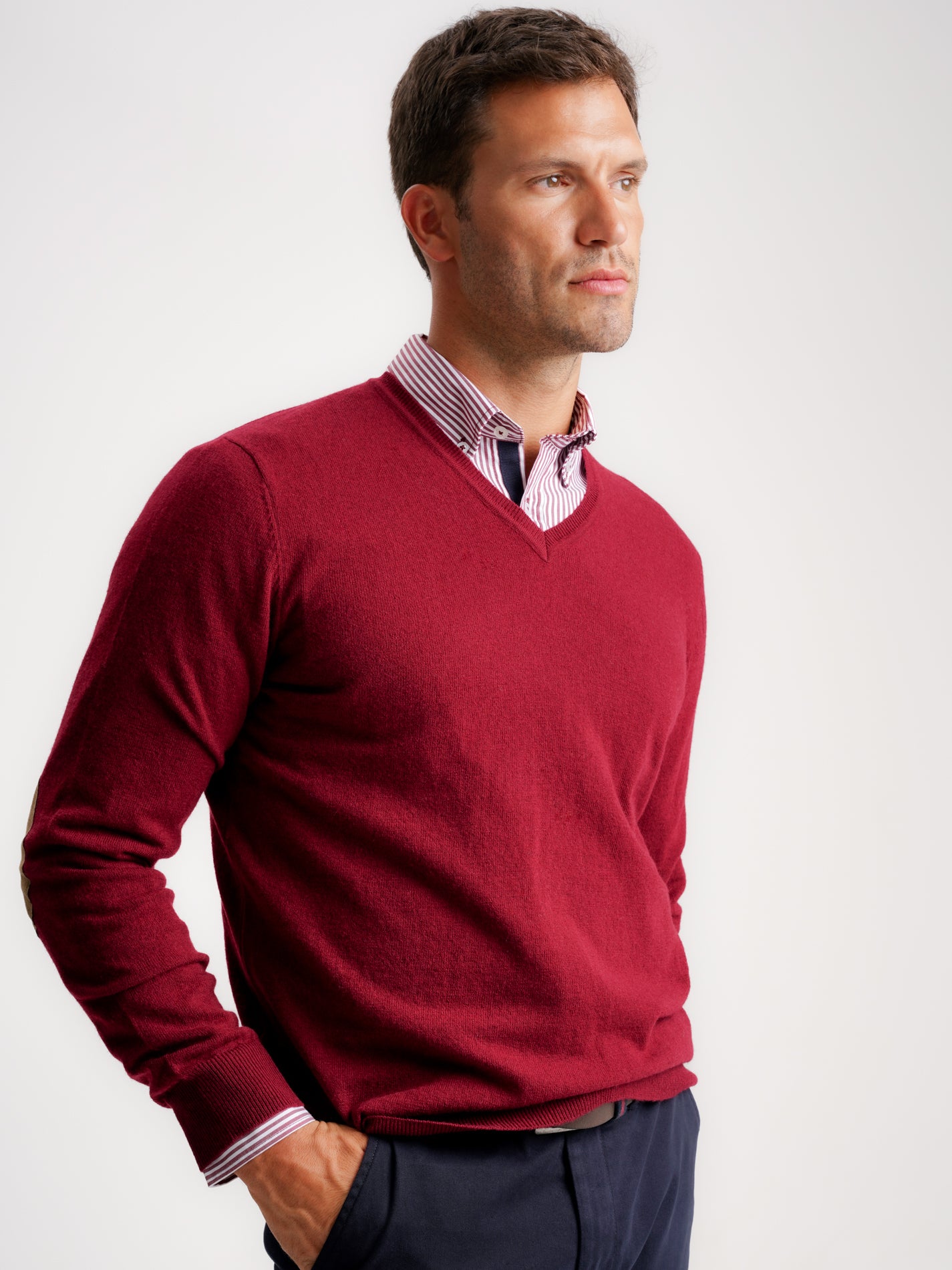 Pullover algodão e caxemira decote em V com cotoveleiras