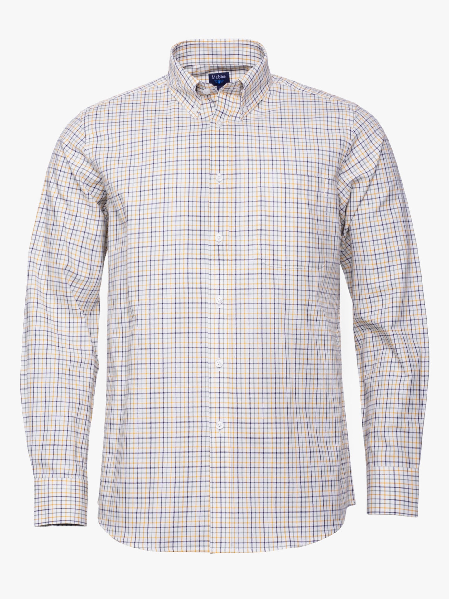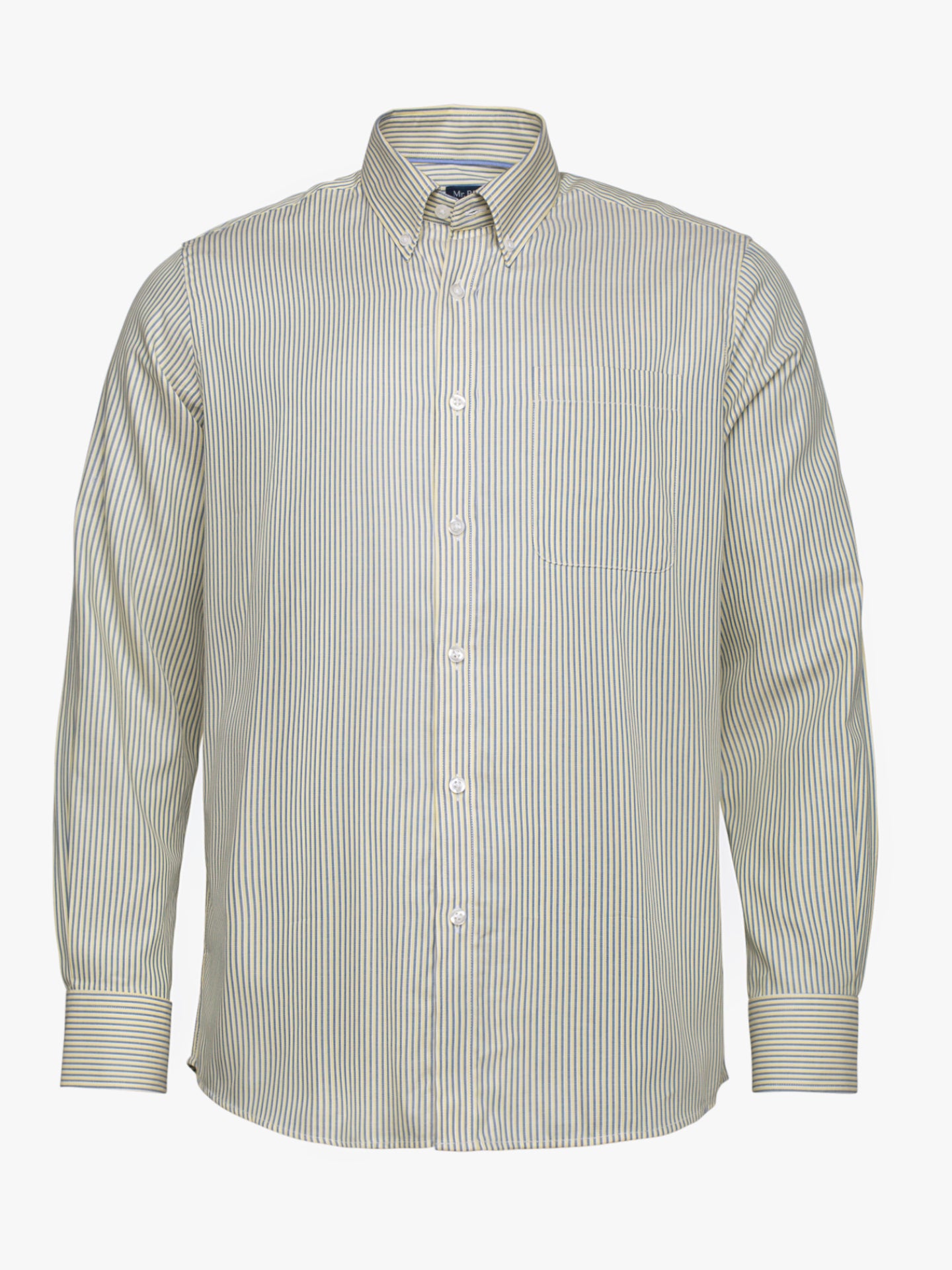 Camisa algodão às riscas azul claro e amarelo com bolso