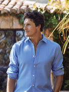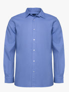 Camisa de homem 100% algodão azul intermédio com logo bordado em vermelho. Corte tailored, colarinho italiano, fecho mediante abotoadura frontal e manga comprida com acabamento em punho abotoado.