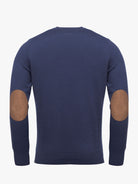 Camisola para homem gola redonda azul escuro com cotoveleiras em castanho. Confecionada em tecido de algodão e lã Merino. Corte casual, gola redonda, manga comprida e acabamentos canelados.